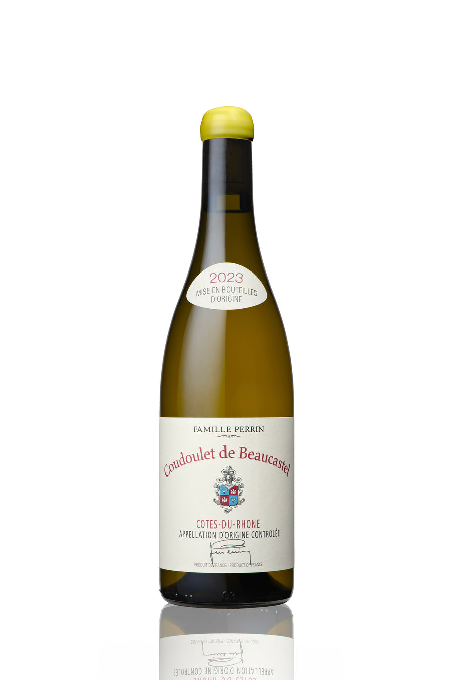 Situé à l’est du vignoble de Beaucastel, le Coudoulet de Beaucastel blanc s’étend sur 3 hectares en appellation Côtes du Rhône. Son terroir de molasse marine du miocène recouvert par un diluvium alpin de galets roulés lui confère une identité singulière. La vendange, récoltée manuellement et rigoureusement triée, est ramassée en caisse puis pressée pneumatiquement avant débourbage. La fermentation s’opère pour partie en pièces de chêne et pour partie en cuves inox, où le vin repose huit mois avant assemblage et mise en bouteille, sans passage à basse température, révélant toute la finesse et l’équilibre de ce grand blanc du Rhône.