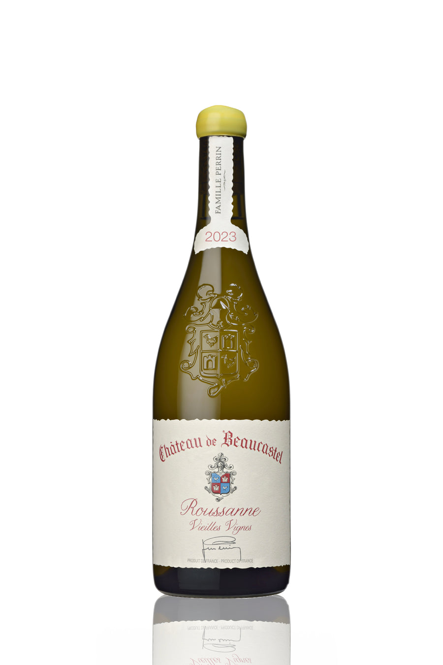 Le Château de Beaucastel consacre 7 hectares de son vignoble aux cépages blancs, plantés sur un sol de molasse marine du miocène recouvert par un diluvium alpin de galets roulés. La vendange, récoltée manuellement et soigneusement triée, est ramassée en caisse puis pressée pneumatiquement avant débourbage. La fermentation s’effectue pour 30% en pièces de chêne et 70% en cuves inox, suivie d’un élevage de huit mois dans les mêmes proportions, avant mise en bouteille. Cette précision d’élaboration révèle l’élégance et l’équilibre caractéristiques des grands blancs de Beaucastel.